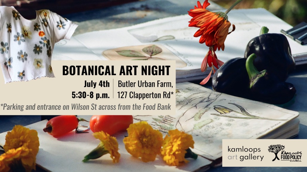 Join the Kamloops Art Gallery and the Kamloops Food Policy Council for a night of botanical art making! Participants can try flower pounding on textiles, or take inspiration from the environment around them to create their own projects. Supplies will be provided. Folks are welcome to bring their own materials and art projects to work on during this time.