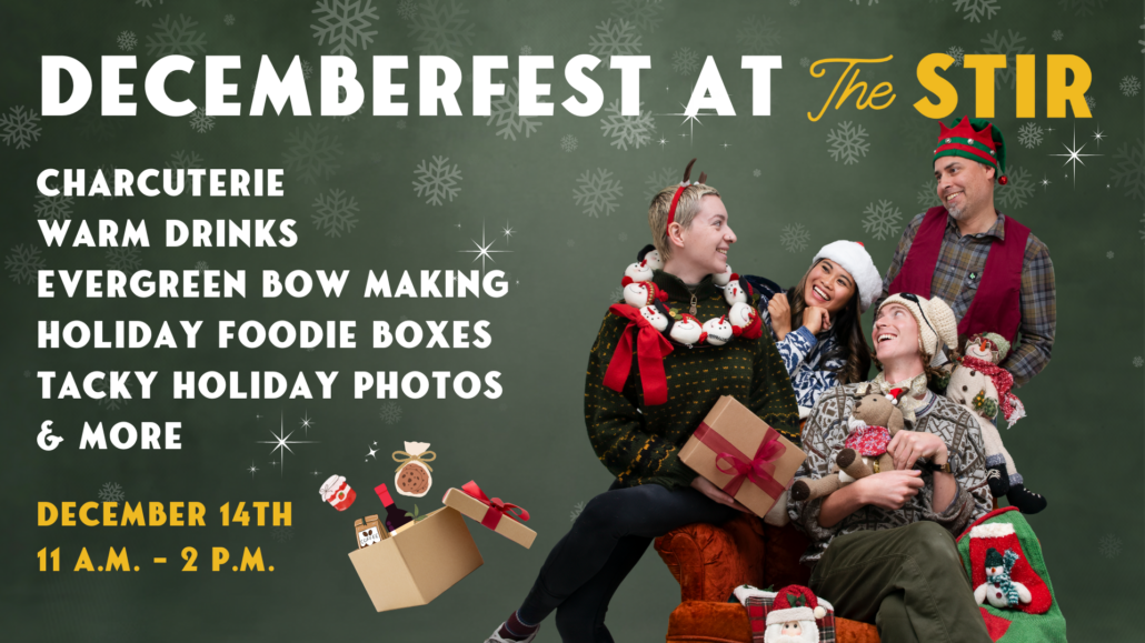 Join us at The Stir on December 14th from 12. – 4 p.m. for Decemberfest!Our Stir Maker Grazing Goat Charcuterie will be vending snacks; you can get a professional (somewhat tacky) holiday photo taken; participate in the Evergreen bow making station; enjoy a warm drink; pick up your Holiday Foodie Box, and more!