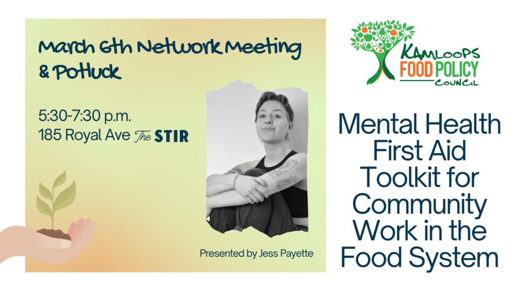 Join us on the first Wednesday of every month from 5:30-7:30 p.m. at The Stir, 185 Royal Ave, Kamloops, to enjoy a potluck and learn about our local food system – everyone welcome!