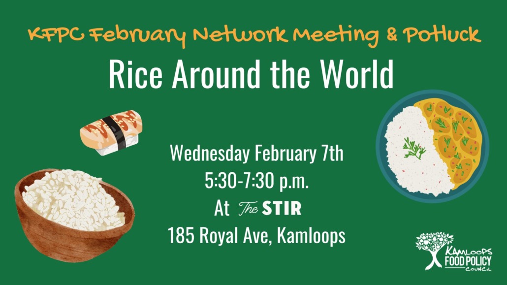 Join us on the first Wednesday of every month from 5:30-7:30 p.m. at The Stir, 185 Royal Ave, Kamloops, to enjoy a potluck and learn about our local food system – everyone welcome!