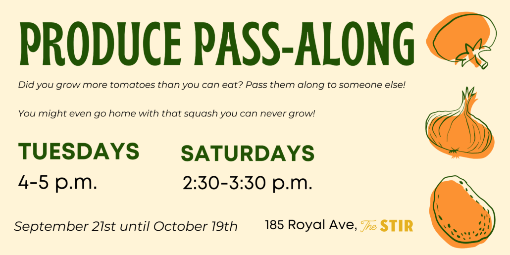 The produce pass-along stand is left out during week, and has Stir staff in attendance on Tuesdays from 4-5 p.m. and Saturdays from 2:30-3:30 p.m.