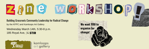 Join the Kamloops Food Policy Council and the Kamloops Art Gallery for a night of zine making on the topic of Building Grassroots Community Leadership for Radical Change. Folks are welcome to bring their own supplies and craft projects to work on during this time.